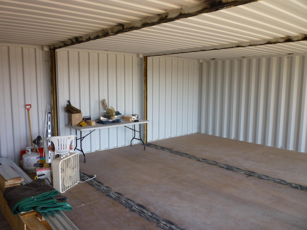 This decision should be made carefully and options should be weighed depending on your budget and the needs of your project. Steve opted for what are known as “one trip containers.” They are new containers that have been built, then used for one shipment to a port near you, and are then emptied and transferred to your specified destination. This is probably the most economical option if you are considering a new container, by limiting the number of trips you also have the advantage of knowing that your floors and walls have little or no exposure to anything strange or toxic. If you have decided a new, or one trip container isn’t right for you, then you’re looking at used containers. First, consider what these containers go through in their normal pattern of use. They are moved with machinery often, spend quite a bit of time at sea, and then are stored in a yard and may or may not be moved again for a long period of time. Things to check for when considering a used container are dent and dings (potential holes), rust, and the condition of the floor. Don’t get me wrong, a few dents and a rusty spot don’t necessarily mean that your container is useless, these things are designed to take a beating and still protect the cargo inside. It’s just important to know the difference between cosmetic damage, and damage that would actually affect the usability of the container. A good way to inspect a used container is to step inside and have someone (preferably someone who’s not mad at you) close the door and “lock you in.” Then just look around, if there are any spots where the light comes through, these are spots that have either rusted through, or been punctured in some way. Use your best judgement here, as this is not a foolproof method of evaluating a container, but it gives your basic idea of the condition of the container. Another thing to keep in mind when considering used containers is inventory limitations, there is no “used container factory,” so if you aren’t happy with the color, or a few dents and dings you might have to slightly alter your plans to accommodate what is available near you.