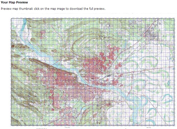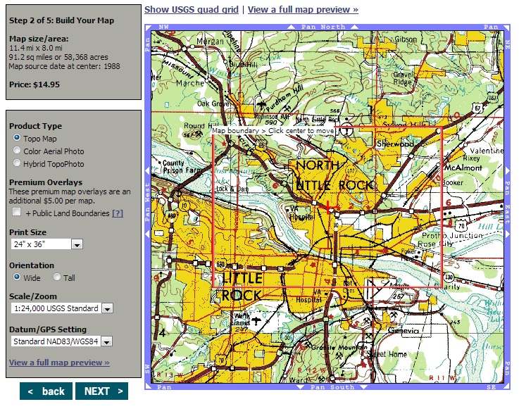 I found that I was able to meet all of these specifications and build a custom mapsheet while visiting MyTopo.com. The process is very simple and prices start as low as $14.95. I believe with shipping my total cost for a fully laminated map was around $35, not too bad. Once you visit the site, you simply click on Start My Custom Map, and then enter an address (or GPS coordinate). For the purpose of this exercise I chose Little Rock, Arkansas.
